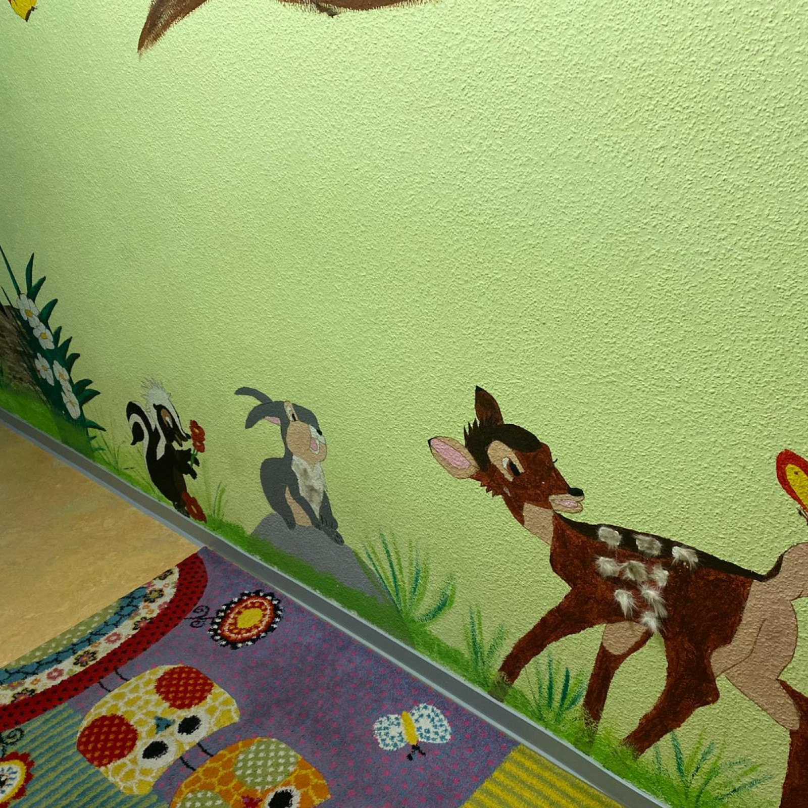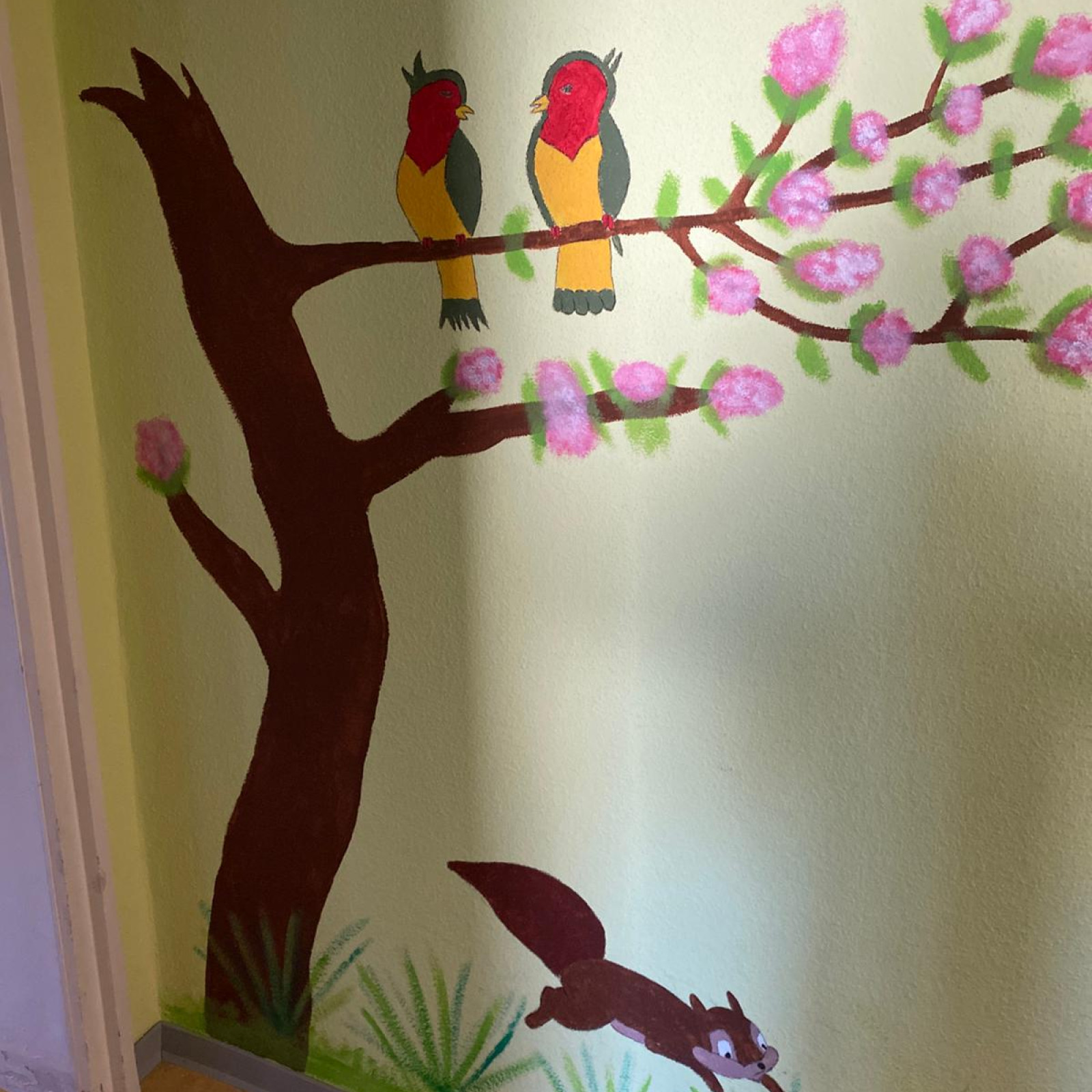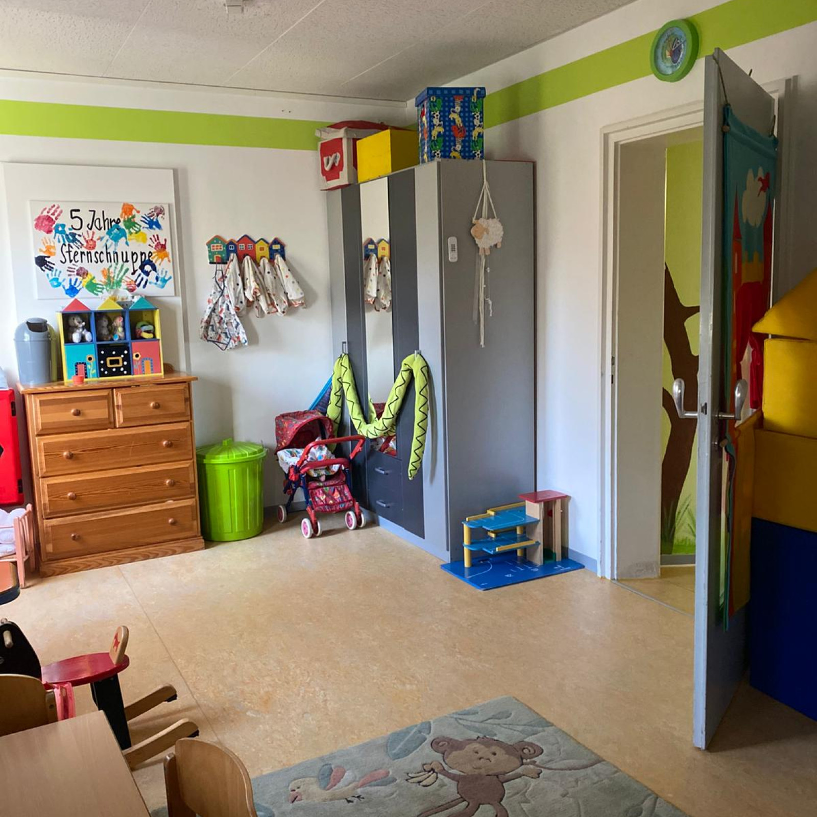 Kinder haben besondere Bedürfnisse an die Einrichtung: der Waschbereich hat einen Wickeltisch, niedrige Waschbecken und eine separate Toilette. Für den Mittagsschlaf oder um sich auszuruhen gibt es den Schlafbereich mit einer eigenen Matratze für jedes Kind. Die Küche ist besonders wichtig: hier bereiten wir – auch oft gemeinsam mit den Kindern – die Mahlzeiten zu und lassen es uns zusammen am großen Tisch schmecken. In den Räumen gibt es verschiedene Bereiche zum Basteln oder Spielen – mache Bereiche werden auch für verschiedene Anlässe umgeräumt.